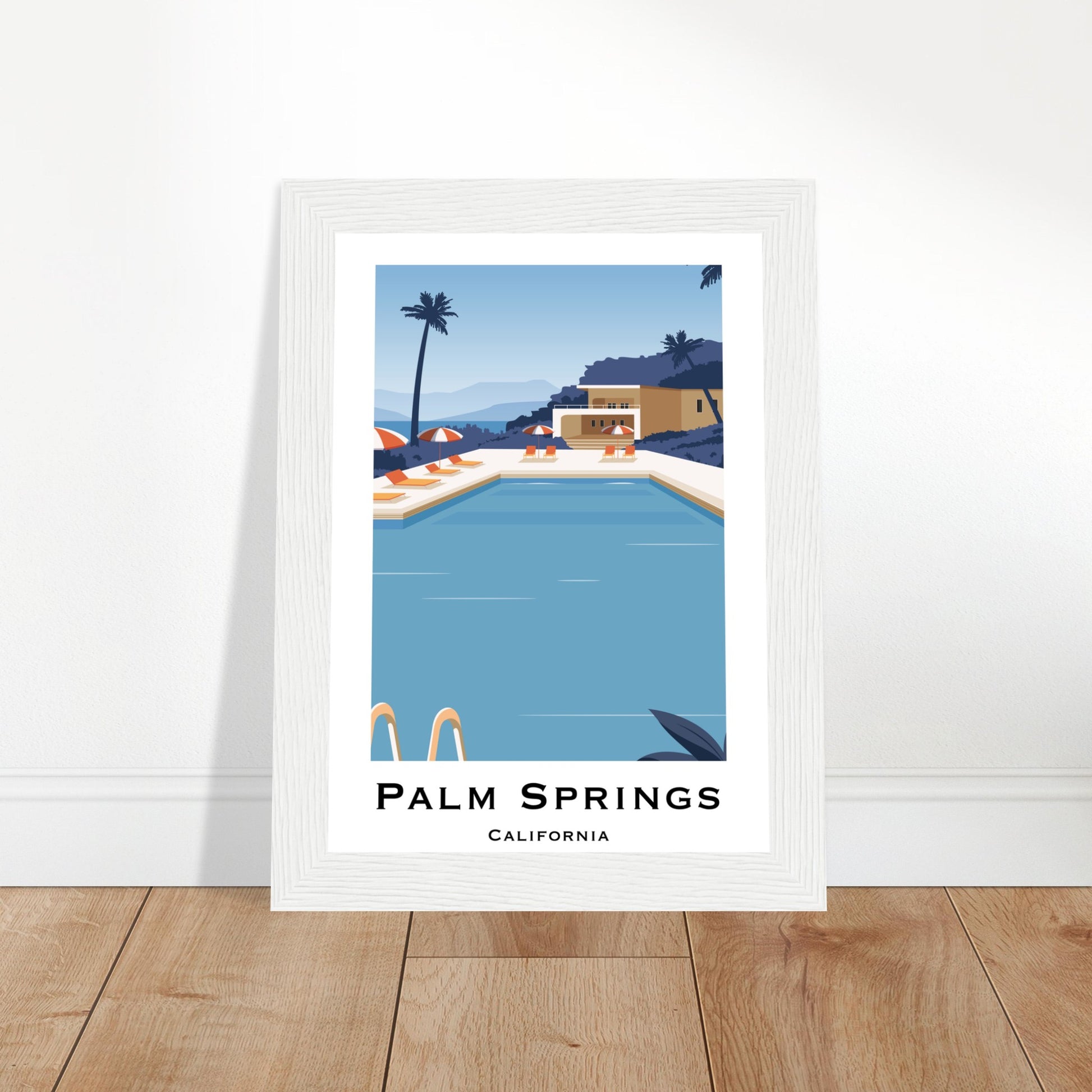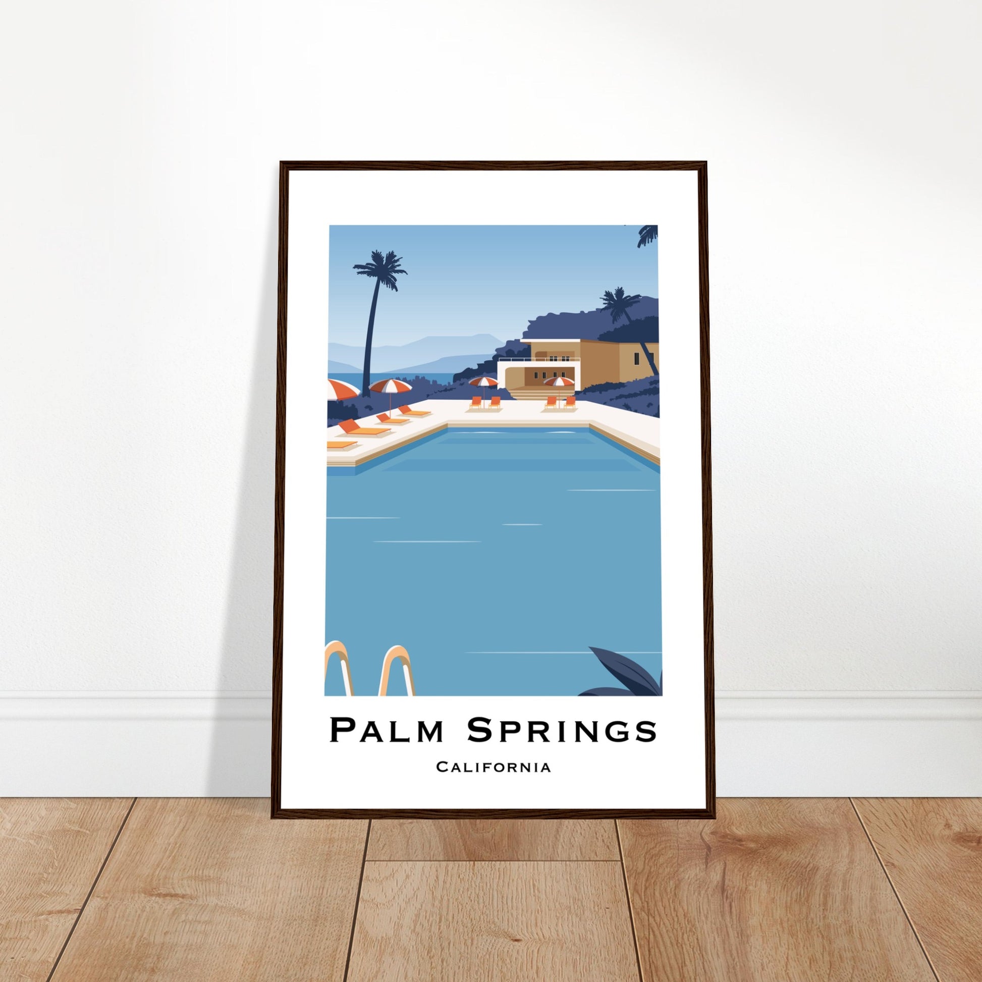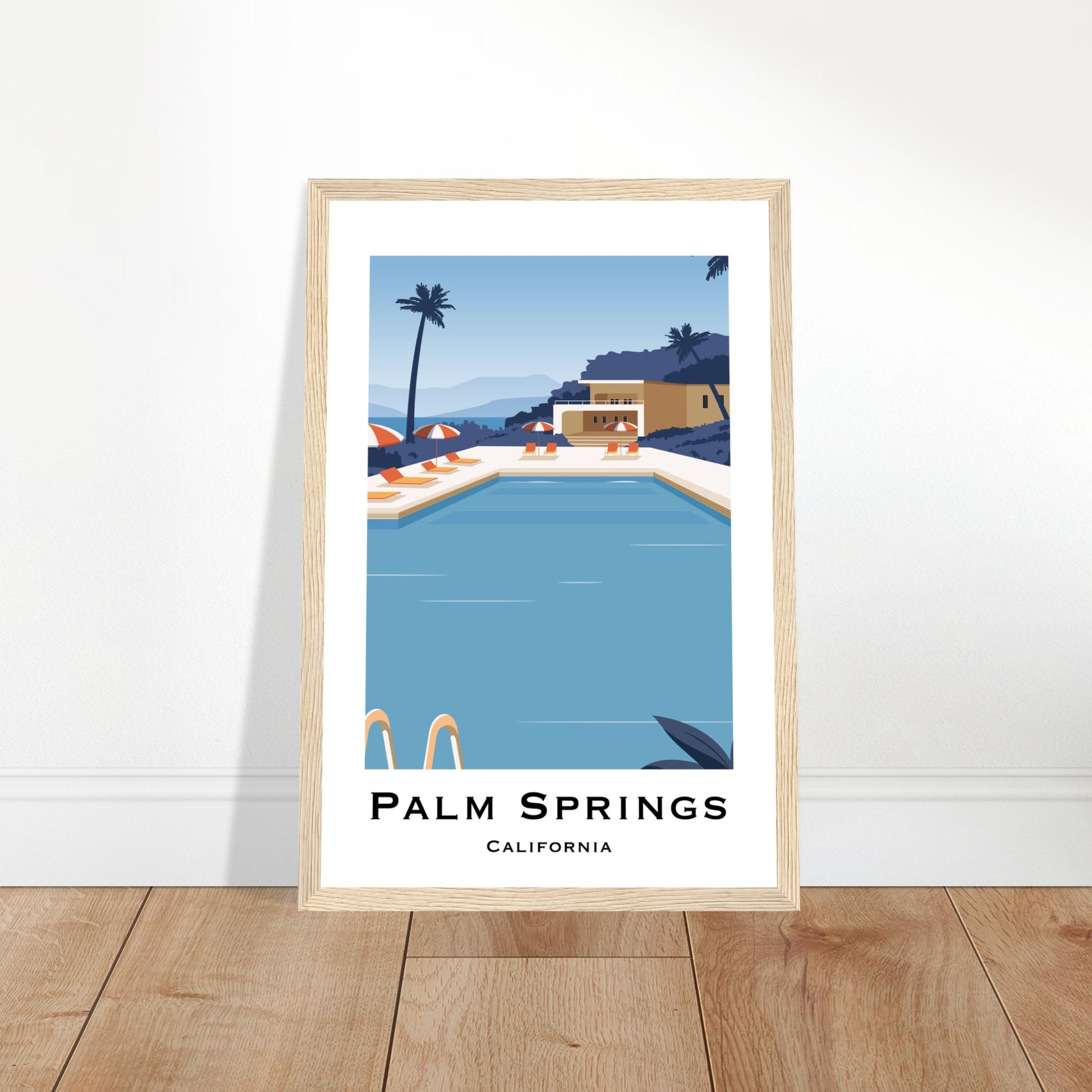Escape to Palm Springs, California with this charming poster. Featuring a serene pool scene surrounded by desert and palm trees, it's the ultimate relaxation reminder. High quality paper and framing options make it the perfect addition to any space. Pool's open, come on in!